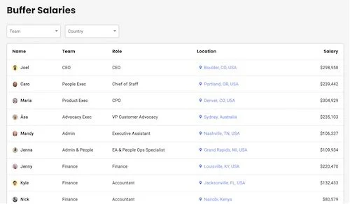 Buffer upholds transparency as a core value by sharing its formula-based approach to compensation, including the complete list of salaries, starting with the CEO.